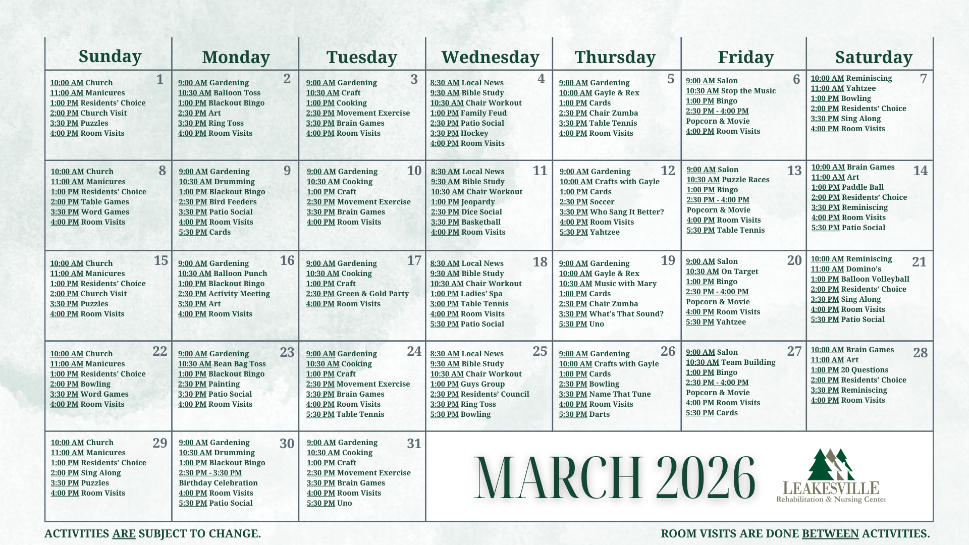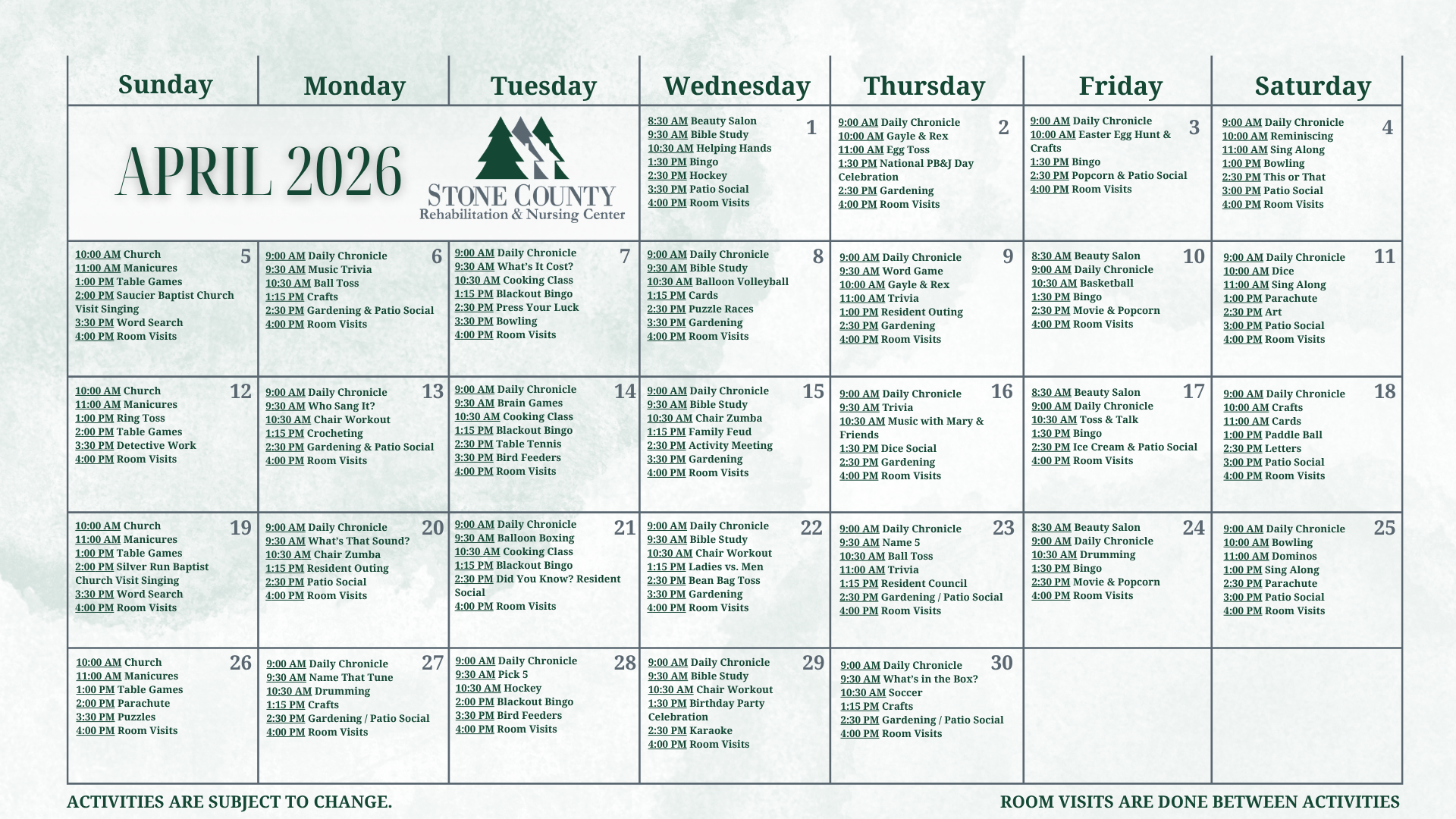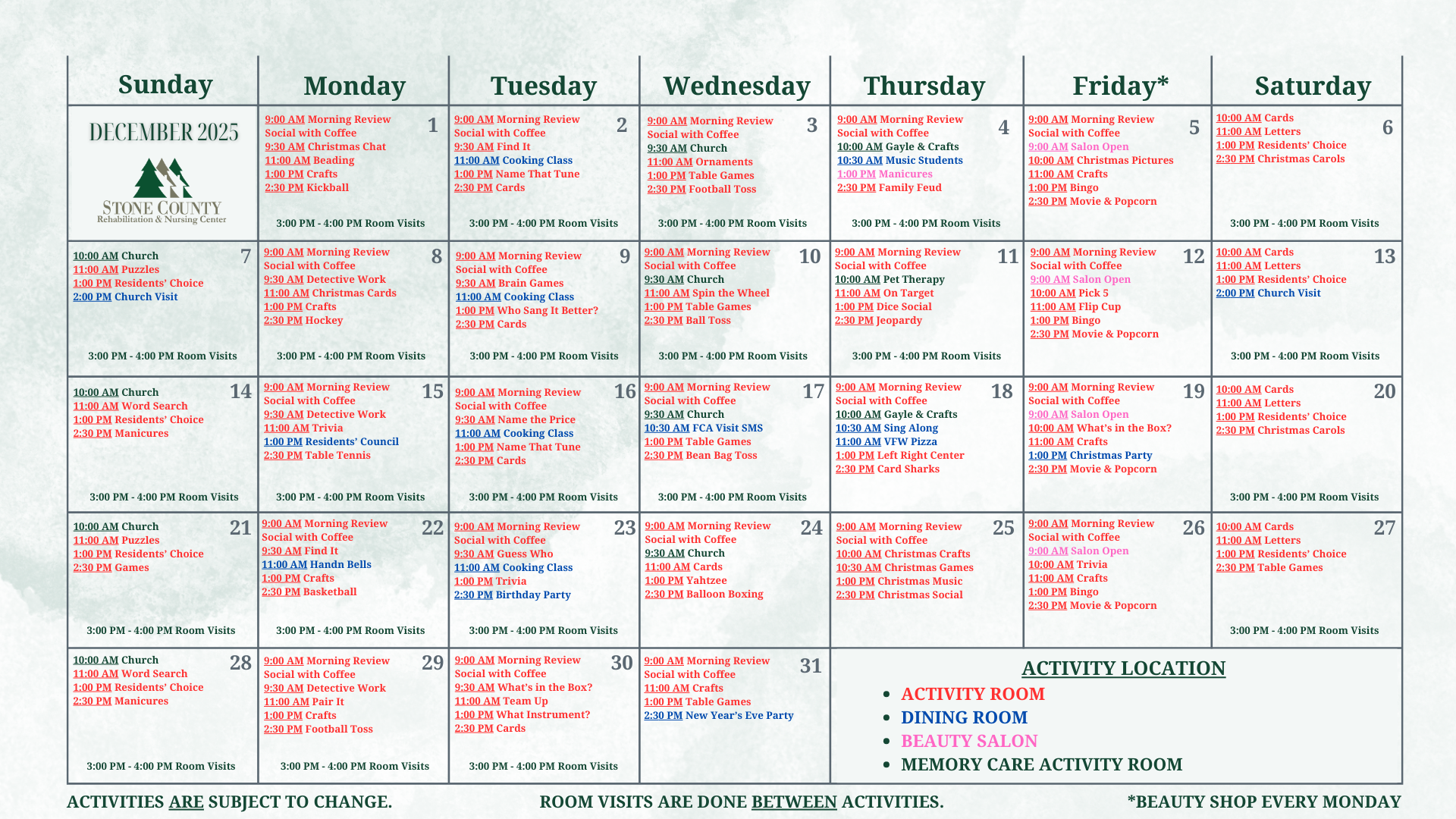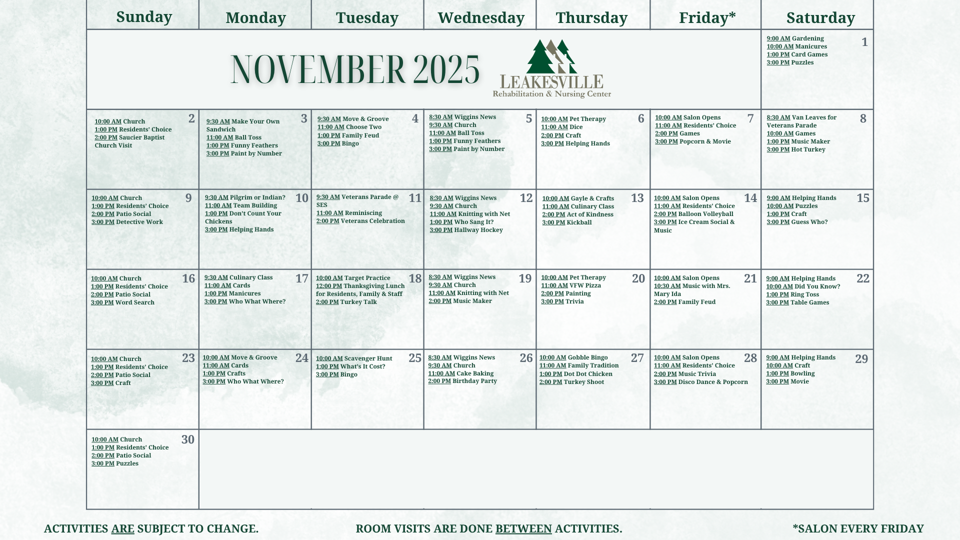 As part of our holistic approach, we believe that having fun and being with other people is the best medicine of all. Our Activities Director has put together a complete calendar of activities and social events for residents, including arts and crafts classes, social events, parties, bingo and other games, prayer services and movie nights. We also have a Hair Salon on site to offer pampering care in between therapy. When patients are in need of a little TLC care, we offer cuts, perms, colors and an array of other salon services.
